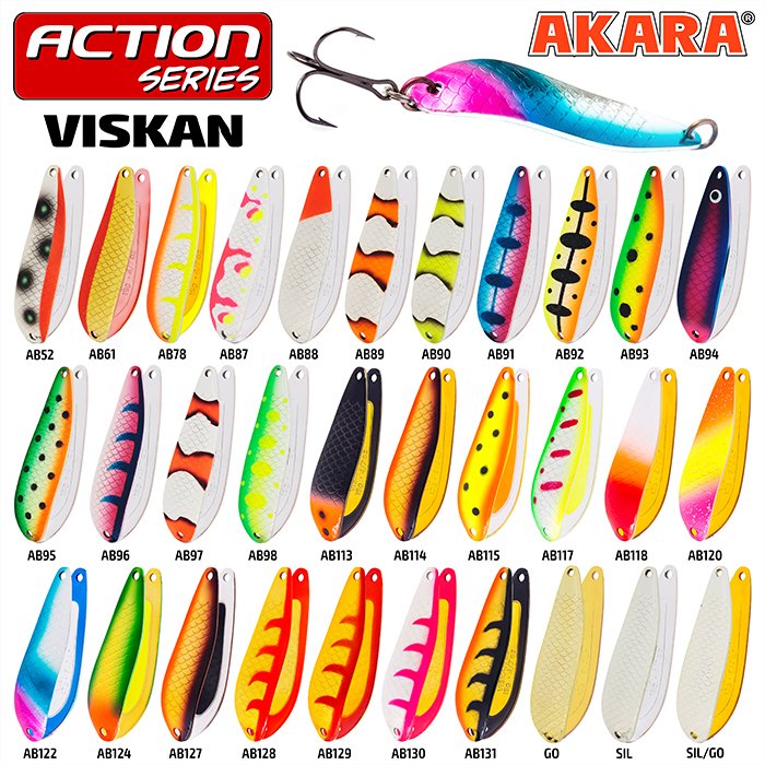 Akara Action Series Viskan – блесна разработана, прежде всего для ловли лососевых. Узкое тяжелое тело обеспечивает отличные полетные характеристики для точного и дальнего заброса, а характерный загиб гарантирует стабильную игру в струе. Приманка отличается резкой, агрессивной игрой, заводится с первых сантиметров проводки. Трофеями Viskan являются: семга, кумжа, чавыча, сима и таймень. В центральной России к ней не останутся равнодушными жерех, щука и судак.