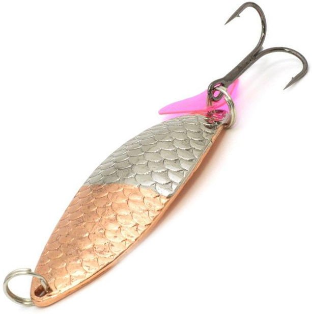 Колебалки серии Crocodile рассчитаны на ловлю довольно крупной рыбы. Масса приманки составляет 21 гр при длине в 7 см. С точки зрения условий ловли приманку можно назвать универсальной. Она проста в управлении и подойдет для начинающих рыболовов. Рифление пластины выполнено в виде чешуи рыбки. Это добавляет схожести с реальным кормовым объектом. На заводном кольце, которое соединяет тройник и блесну, есть еще один провоцирующий элемент. Это пластиковый розовый хвостик, делающий игру более активной и дразнящей. Он заставляет хищную рыбу атаковать именно там, где спрятан крючок. При проводке приманка бликует, как и чешуя настоящей рыбки. Оснащается тройным крючком, готовым к вываживанию трофея..