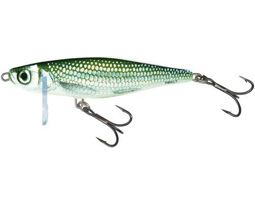 Thrill S идеально подходит для ловли таких хищных представителей как щука, жерех или голавль. Разработано несколько модификаций этой модели, отличающихся по весу, размеру, но их все объединяет одинаковое расположение крючков и конструкция. Отличительной особенностью воблера Salmо Thrill является то, что он относится к тонущим приманкам, что позволяет варьировать глубину погружения от 0,5 до 5 м. Выбор делайте исходя из того, что чем больше масса и размер воблера, тем на большее расстояние вы сможете забросить приманку. Спиннинг можно двигать медленно, на одинаковой скорости, высоко поднимая его над поверхностью воды. А можно вести лов подергивающими движениями, как бы создавая эффект того, что мелкая рыбёшка выпрыгивает из воды. Возможен и смешанный вид движения спиннинга, когда полная остановка чередуется с резкими подъёмами.Внешний вид воблера Salmо Thrill идеально имитирует мелкую рыбку, а острейшие тройники этой модели практически полностью исключает возможность того, что рыба сорвётся.