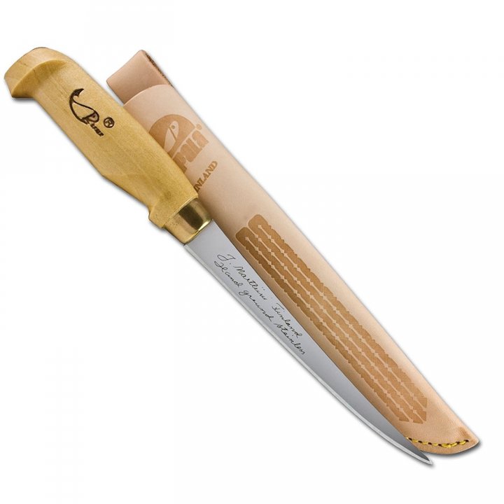 Нож Rapala FNF7,5 с равномерно сужающимся клинком из нержавеющей стали длиной 19 см, с острым лезвием и хвостовиком во всю длину рукоятки. Рукоять сделана из березы и покрыта лаком. Поставляется с ножнами из качественной тисненой кожи.